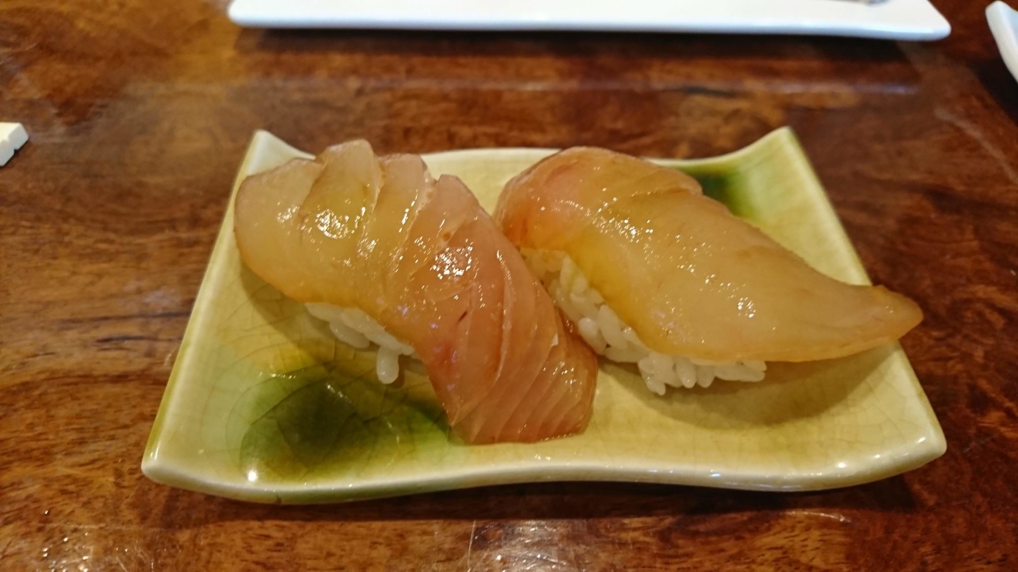 メダイのべっこう寿司を2貫注文しました。漬けで、上品なピリ辛さが伝わってきます。おいしいです。